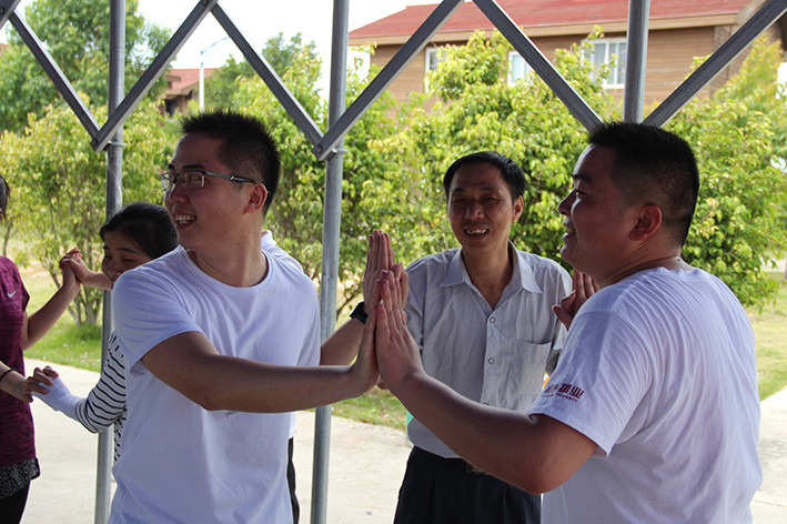 首先在“團(tuán)隊(duì)破冰”活動拓展教練教大家通過一系列輕松有趣的熱身操、熱身游戲,讓大家打消彼此隔膜、拉近距離,為全天的訓(xùn)練活動做好身心準(zhǔn)備?;顒又?,大家肩并肩、手拉手圍成大圈,聽著拓展教練的指令一起做趣味協(xié)作游戲“老爺爺賣花”,根據(jù)口令形成規(guī)定人數(shù)的組合,落隊(duì)的成員就要接受指定懲罰表演,不僅考察了大家的反應(yīng)能力,也讓大家在游戲中放松心情,調(diào)整狀態(tài)。