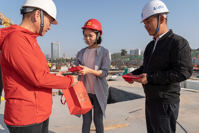 大年初三(2月14日)下午,廈門恒興集團(tuán)董事長柯希平、副總裁白玉淵,廈門市恒興教育投資有限公司董事長柯嵐嵐、副總經(jīng)理傅巧端等一行走訪了項目設(shè)計單位壘智設(shè)計集團(tuán)和項目施工現(xiàn)場,為每一位堅守崗位的工作人員送上春節(jié)紅包及新春祝福。